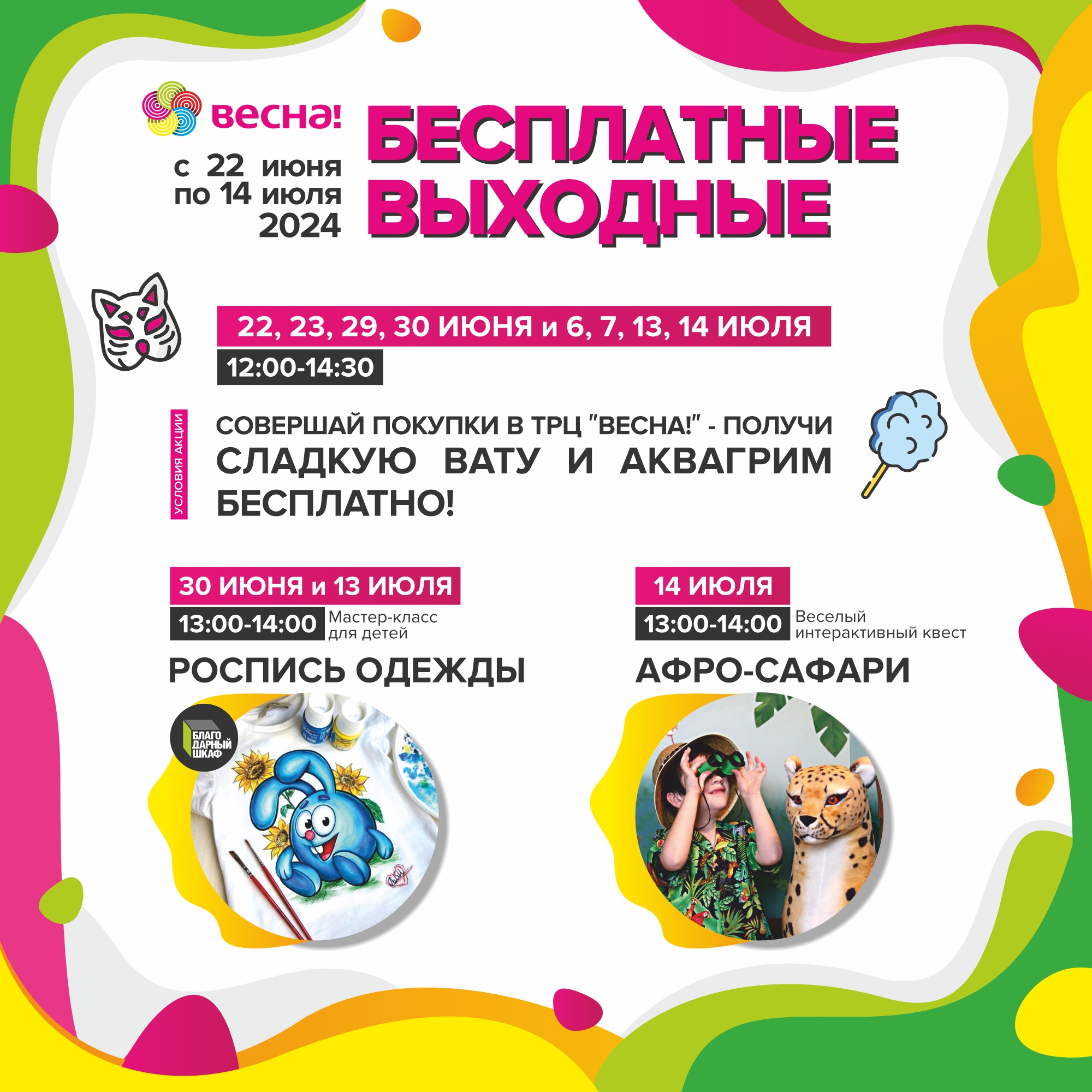 ТРЦ «Весна!» приглашает вас на БЕСПЛАТНЫЕ ВЫХОДНЫЕ с 22 июня по 14 июля 2024 года! Программа мероприятий: *Совершай покупки в ТРЦ «Весна!» и получай сладкую вату и аквагрим БЕСПЛАТНО! *Мастер-класс для детей "Роспись одежды" *Веселый интерактивный квест «Афро-сафари» Не пропустите! Ждём вас!